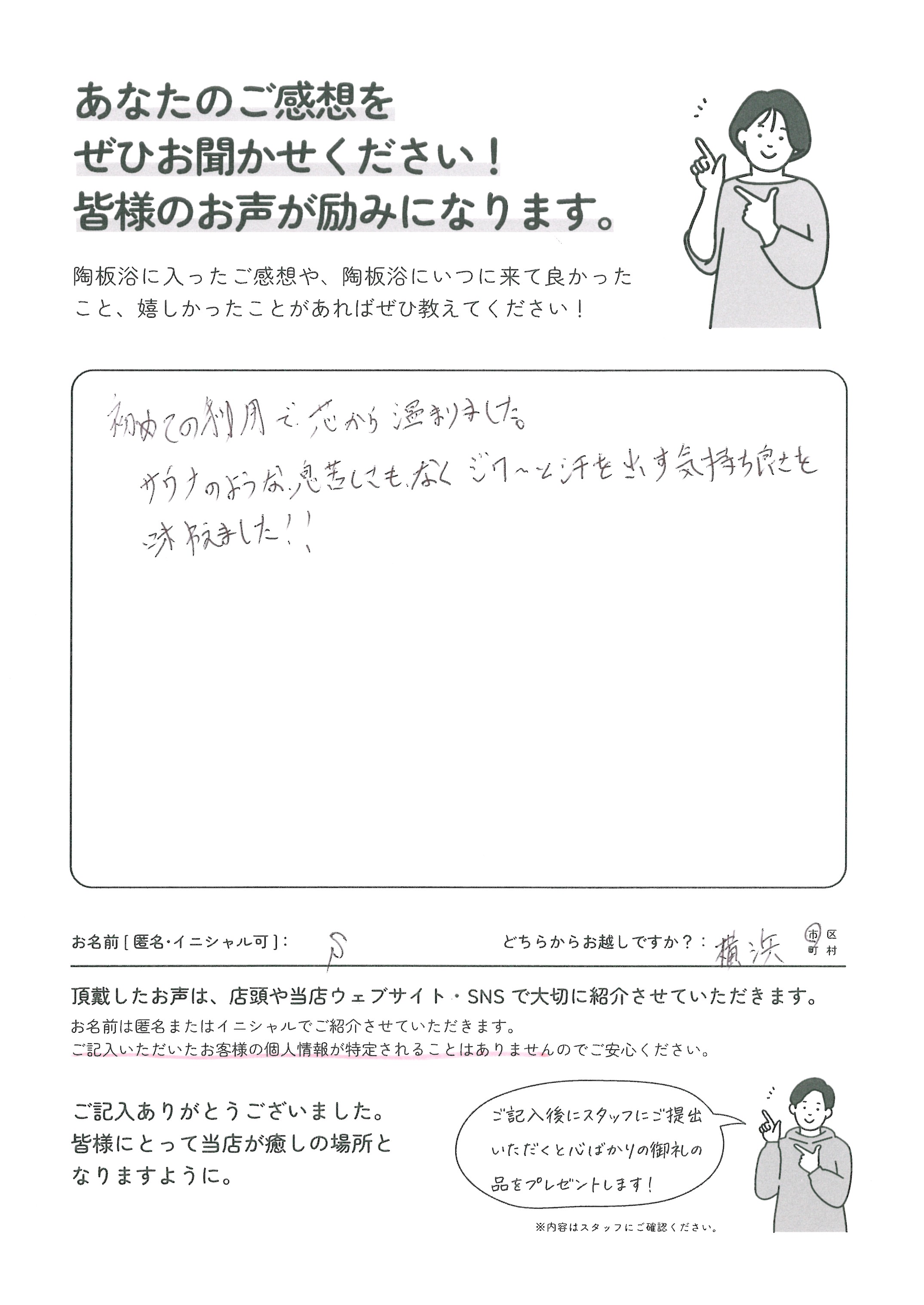 S様 「ジワ~と汗を出す気持ち良さを味わえました」 初めての利用で、芯から温まりました。 サウナのような息苦しさもなく、ジワ~と汗を出す気持ち良さを味わえました!! M様 「体の芯からポカポカになりました」