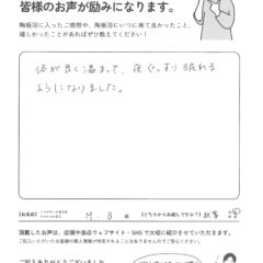 S様 「ジワ~と汗を出す気持ち良さを味わえました」 初めての利用で、芯から温まりました。 サウナのような息苦しさもなく、ジワ~と汗を出す気持ち良さを味わえました!! M様 「体の芯からポカポカになりました」 M.B様 「体が良く温まって、夜ぐっすり眠れるようになりました」